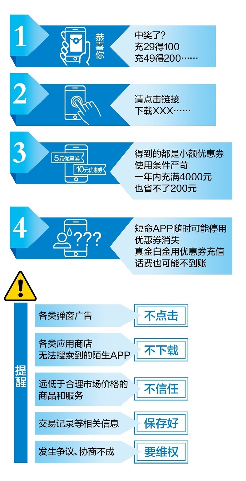打开各种手机软件,以及日常生活中涉及到扫码应用时,不少人可能会被“幸运”砸中。100元、200元的话费,花上几十块钱就能得到。然而付了款,买的却只是小额优惠券。省不了几块钱,用不了几张,充了值,还可能不到账。对这类骗局,您可要多留心。