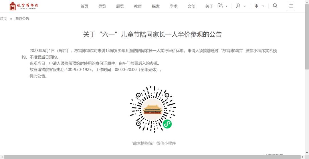 25日,故宫博物院发布公告,2023年6月1日(周四),故宫博物院对未满14周岁少年儿童的陪同家长一人实行半价优惠。申请人须提前通过“故宫博物院”微信小程序实名预约,不接受当日预约。参观当日,申请人须携带预约时使用的身份证原件,由午门检票后入院参观。