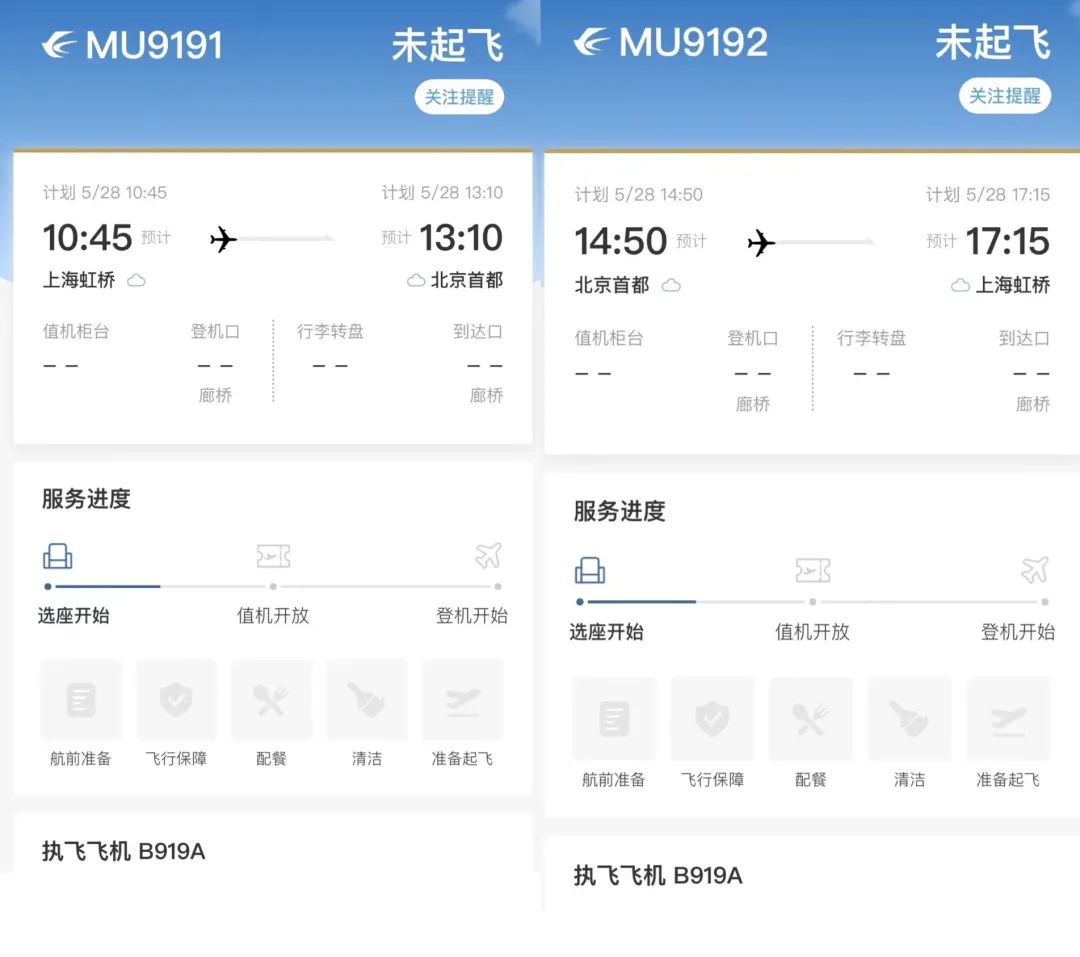 此外,5月26日稍早些,澎湃新闻记者在东航APP上查询发现,东航C919首个商业航班飞行计划公布,班次为5月28日MU9191上海虹桥-北京首都,MU9192北京首都-上海虹桥,计划飞行时长2小时25分钟。