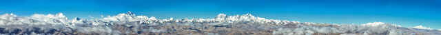 这是喜马拉雅山脉五座海拔8000米以上的高峰。从左到右依次为:马卡鲁峰、洛子峰、珠穆朗玛峰、卓奥友峰、希夏邦马峰(5月26日摄,拼接照片)。