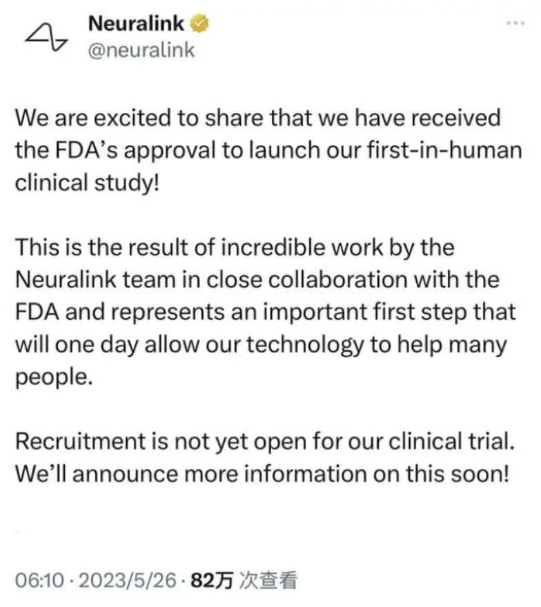 Nueralink于当地时间5月25日宣布,已获得美国FDA批准,将开始首次大脑植入物人体临床研究。