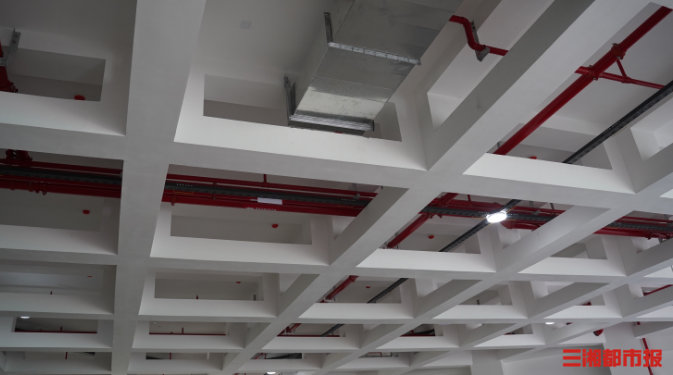 不同于传统厂房的水、电、风等管道,都是纵横交错穿插于楼层梁之下。来到1号栋1楼,记者注意到,天花板的位置,一个个镂空的方块“藏住”了这些错综复杂的管道系统。经介绍,这样既减轻了楼板的自重、节约了大量空间,又美观好看。