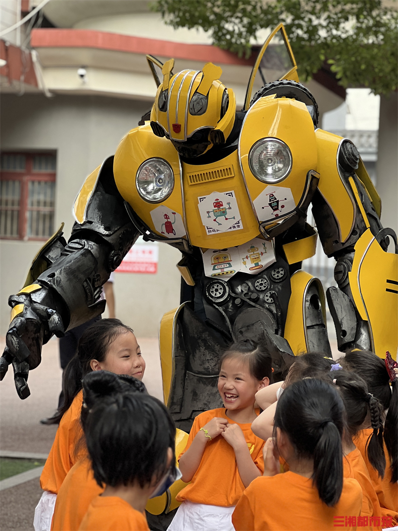 3D打印课程、AI象棋机器人、3D打印笔、儿童脚踩火箭……一走进学校操场,迎面而来的就是变形金刚大黄蜂,孩子们和它握手、拥抱,正玩得不亦乐乎。另一边,机器人搭建比赛正如火如荼进行,孩子们紧锁眉头、目不转睛地使用梁、销等积木零件搭建伸缩夹,待一番思索后,有条不紊地拨弄手中的零部件自主搭建机器人,通过比赛体会机械结构在实际生活中的应用。这些丰富的科技体验项目让每一个孩子都能动手探究,充分感受科技的魅力,埋下一颗小小的种子。
