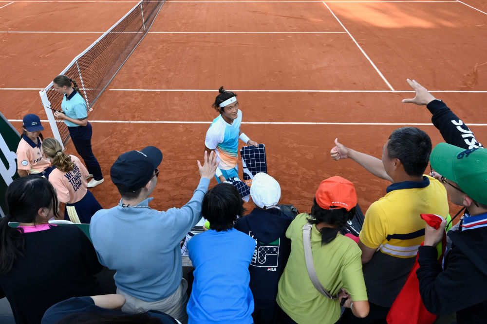 5月29日,张之臻向观众致意。新华社发(朱利安·马蒂亚摄)