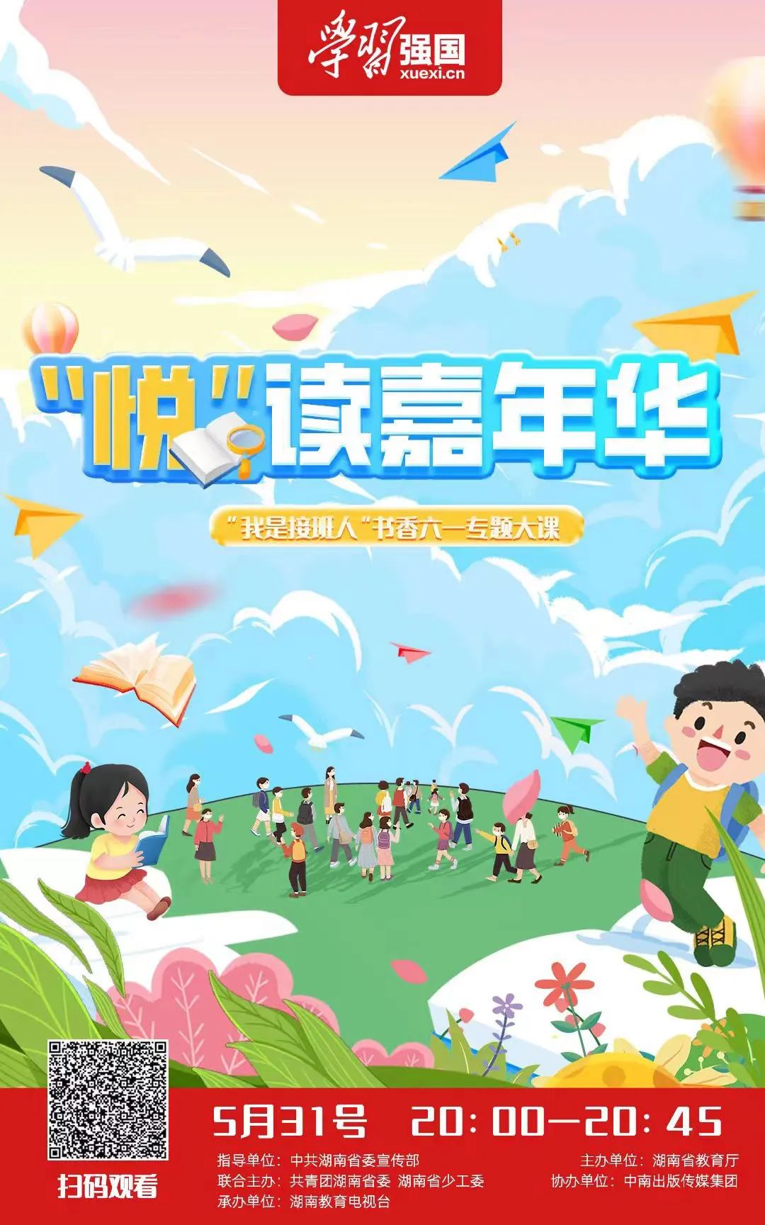 阅读点亮智慧,书香润泽心灵!“我是接班人”网络大课堂六一专题大课《“悦”读嘉年华》,将于5月31日20:00——20:45在“学习强国”平台“推荐”频道同步直播,书香六一,我们一起度过!