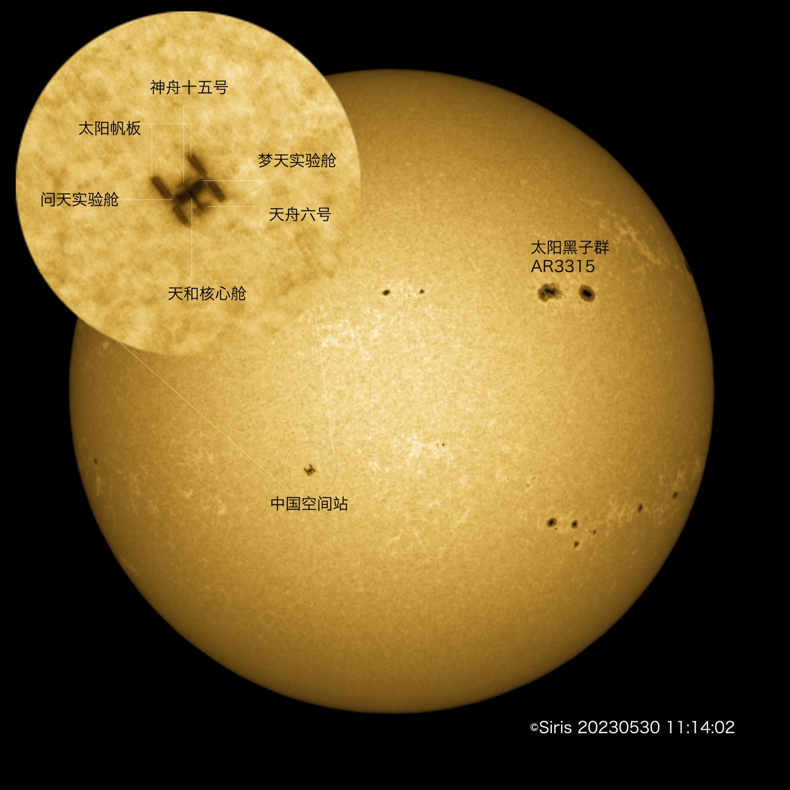 因为需要对接30日成功发射的神州十六号飞船,本次中国空间站经过日面时,与观测点仅398.8km,投下的剪影“个头”较大,三舱两船(天和核心舱、问天实验舱、梦天实验舱、神舟十五号、天舟六号)的构型清晰可见,甚至可以看清太阳帆板间的缝隙。中国空间站视大小尺寸达20角秒,“个头”较大。