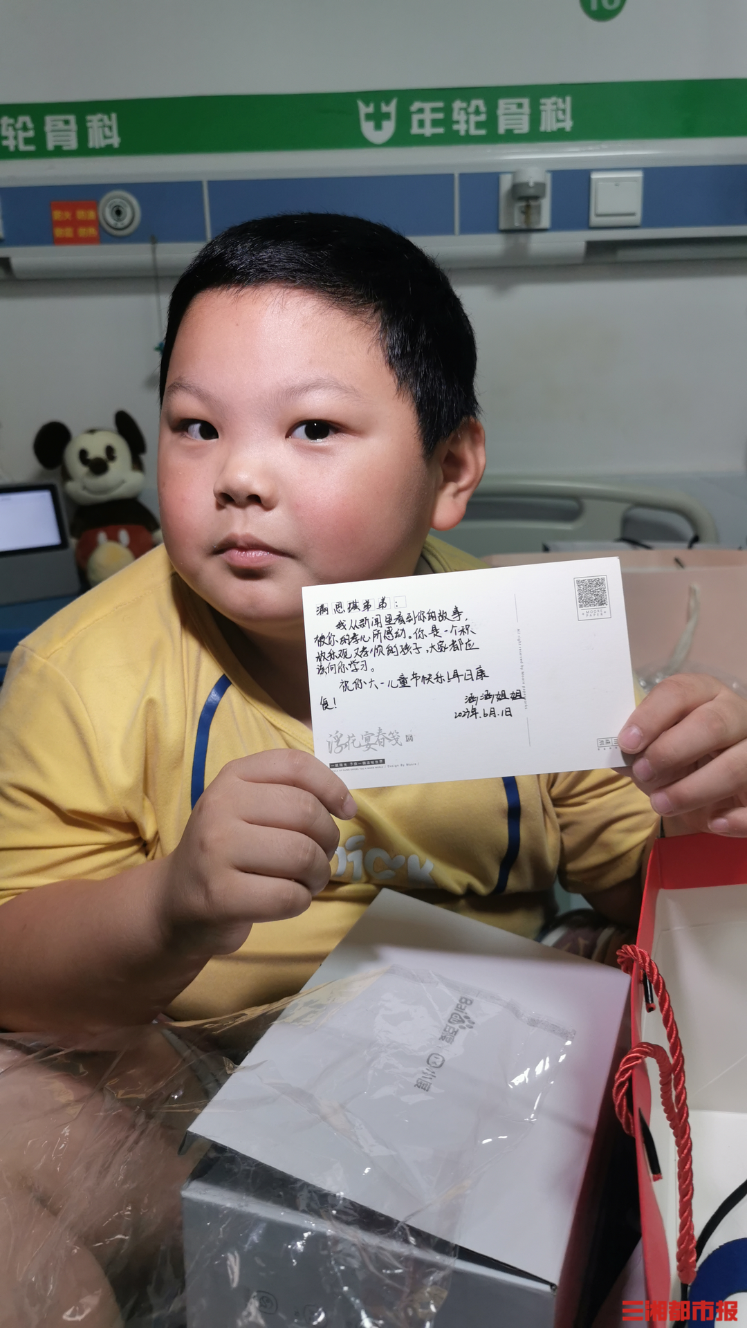 三湘都市报·新湖南客户端6月1日讯(全媒体记者 叶竹)“我从来没有过过像今天这样的儿童节。”连日来,“马蹄足”男孩满斯棋照顾病父满小华的故事引发社会关注。此前三湘都市报联合阿里公益天天正能量,为坚强乐观的满斯棋颁发了“天天正能量特别奖”及奖金两万元(详见本报5月27日A4版)。6月1日,适逢儿童节,看到本报报道的社会各界爱心人士带着学习机、超人服、书包等礼物,来到长沙星沙年轮骨科医院,为满斯棋度过了一个特别儿童节。