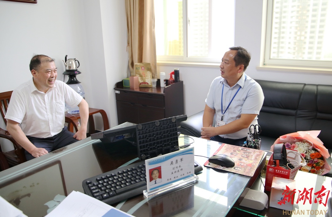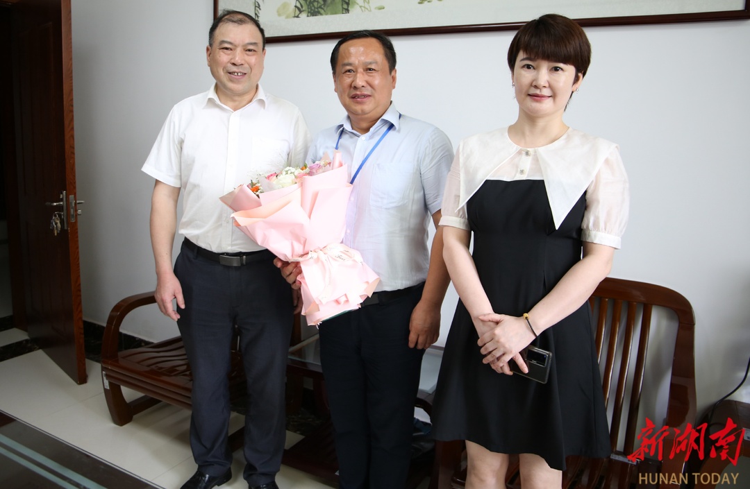 大众卫生报·新湖南客户端6月2日讯(通讯员 段斌)5月30日一大清早,国内知名病理学家、湖南省卫生健康高层次人才、湘潭市第一人民医院副院长吴勇军主任医师就收到湘潭市科学技术协会党组书记谢兰焰“祝吴院长科技工作者日节日快乐!”的祝福短信,这让吴勇军感到特别的暖心。上午十点,受湘潭市科协党组委托,科协党组成员、副主席蒋长湘,学会部部长刘冉一行3人来到市一医院,代表市科协慰问一医院科技工作者代表吴勇军主任医师。蒋长湘一行为吴勇军献上了鲜花,向他致以节日的问候,并对他为湘潭市医学科技工作作出的重要贡献及对科协工作的支持表示感谢!随后,他们与吴勇军进行了交流。蒋长湘主席谈道:一直以来,尤其是在三年疫情防控期间,广大医务科技工作者始终保持医者“敬佑生命、救死扶伤、甘于奉献、大爱无疆”的崇高精神,为保障人民群众生命安全和身体健康作出了突出贡献。