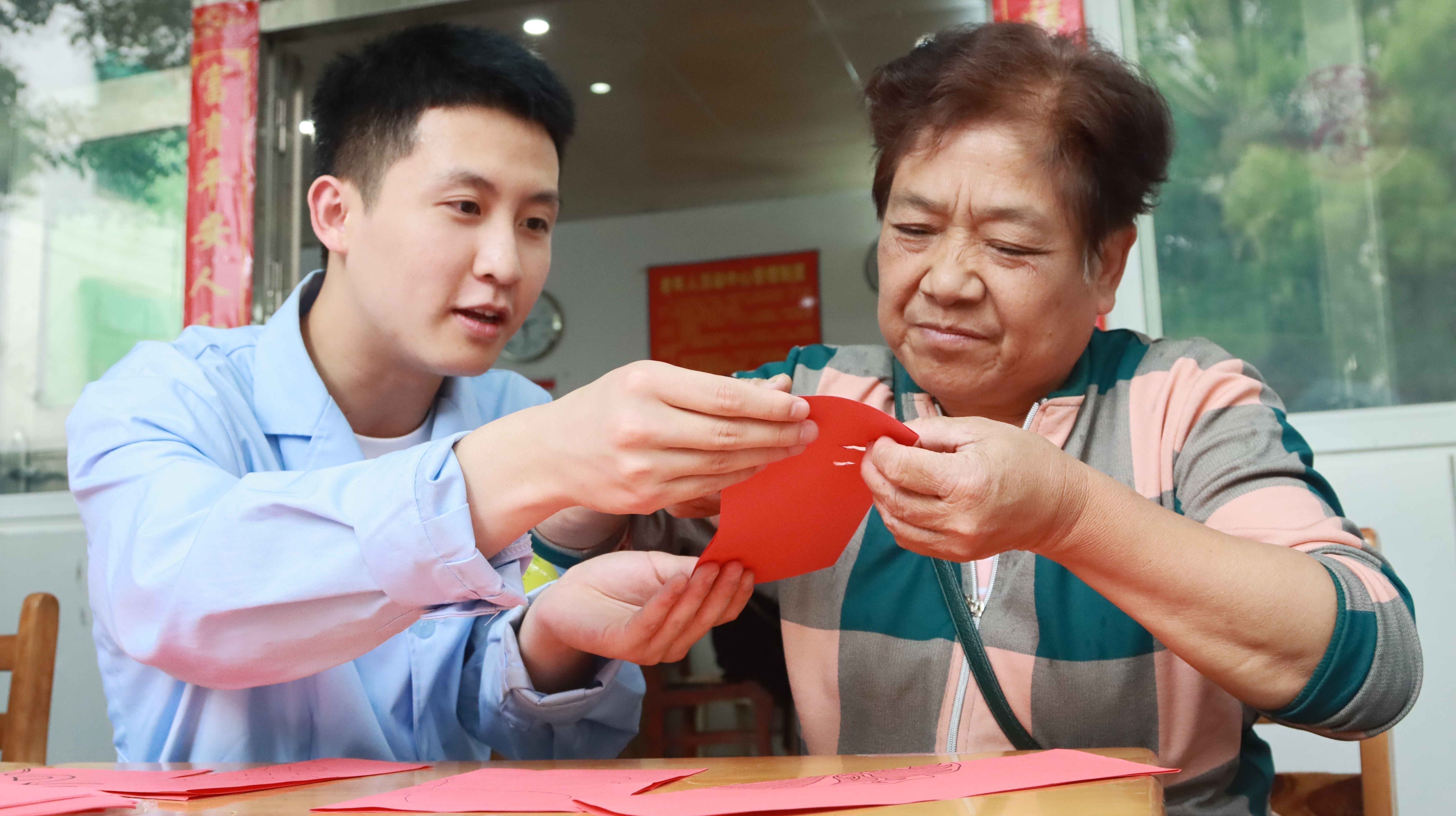 在“夕阳之春”社团活动中,潘青锋(左)辅助老人开展剪纸活动,锻炼手指灵活度。王云娜摄
