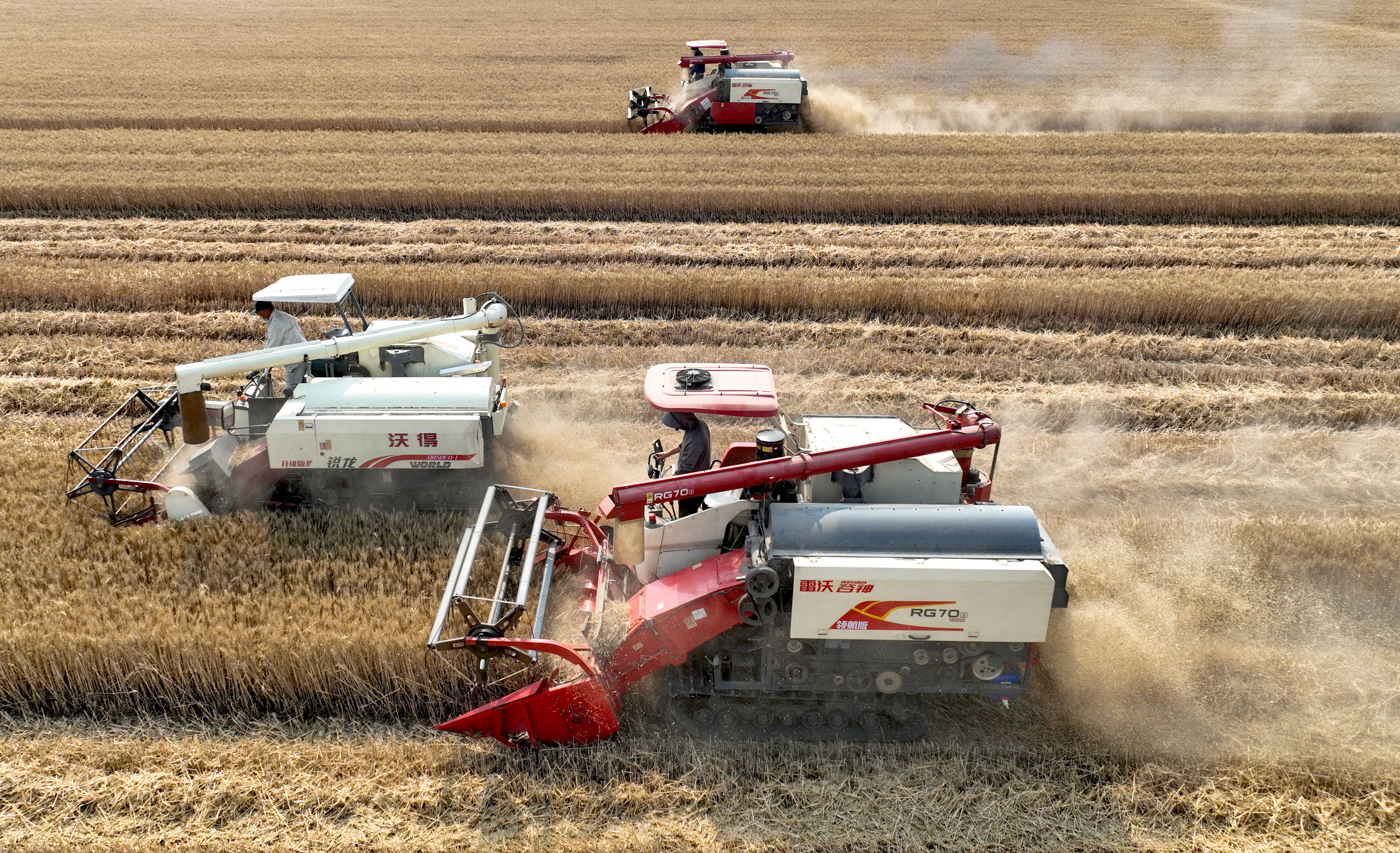 在湖北,枣阳市农业综合执法大队三中队中队长王富锋介绍,自5月15日小麦开镰收割以来,全市共组织本地稻麦联合收割机7445台、外来跨区作业收割机1400多台,展开机收大会战,确保小麦机收率99%以上。