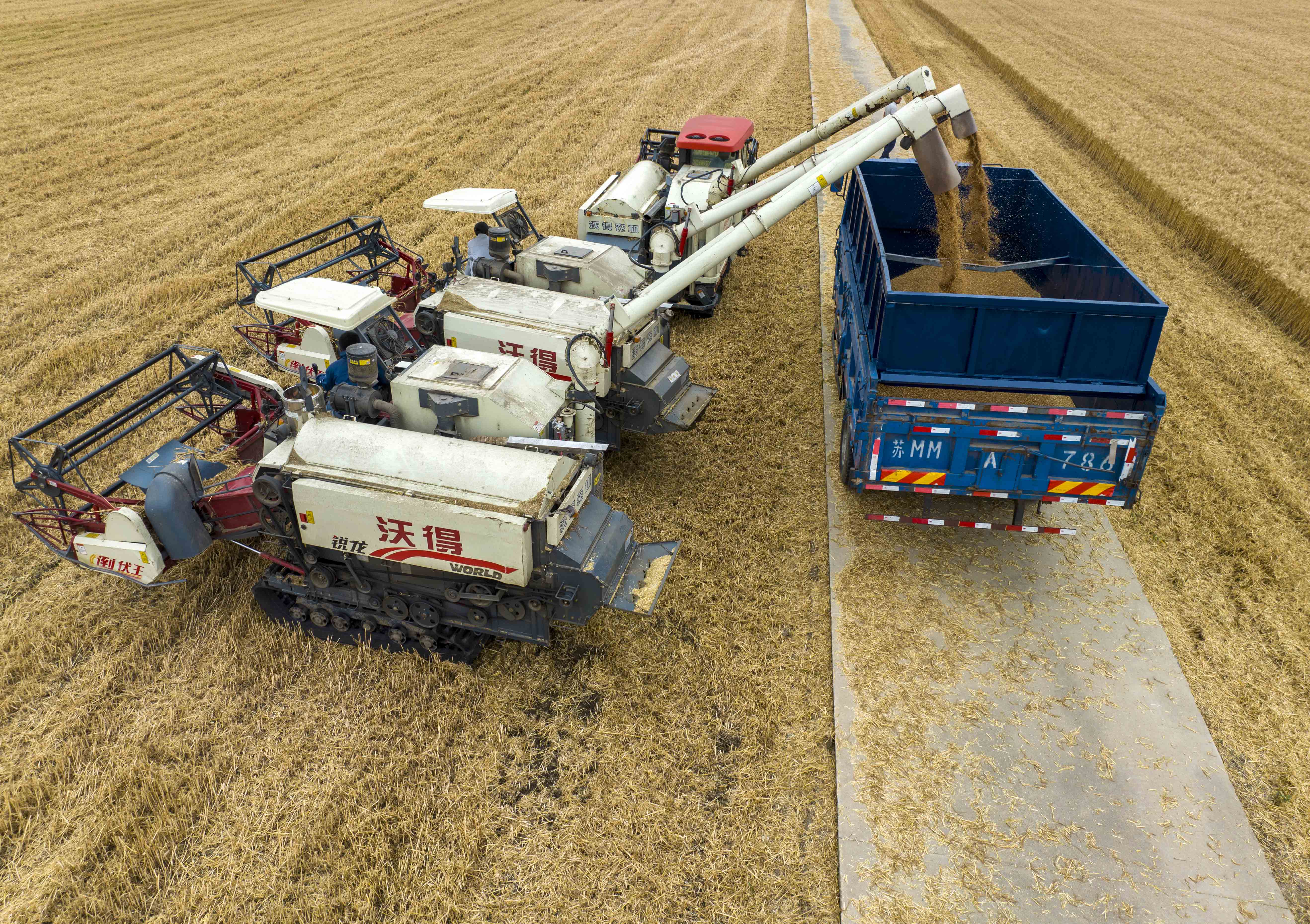 平原县农业技术推广站站长田殿彬说,当地将在6月10日开始大面积机收,地头上收割的新麦将随着运粮车直接送往烘干塔进行烘干入库,实现从田间到粮仓“不落地”,与传统晒粮方式相比,能减少4%的损耗。