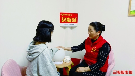 (湖南天恩辅仁职业培训学校校长、国家注册心理咨询师路得在为临考的学生做心理辅导。 李琪 摄)