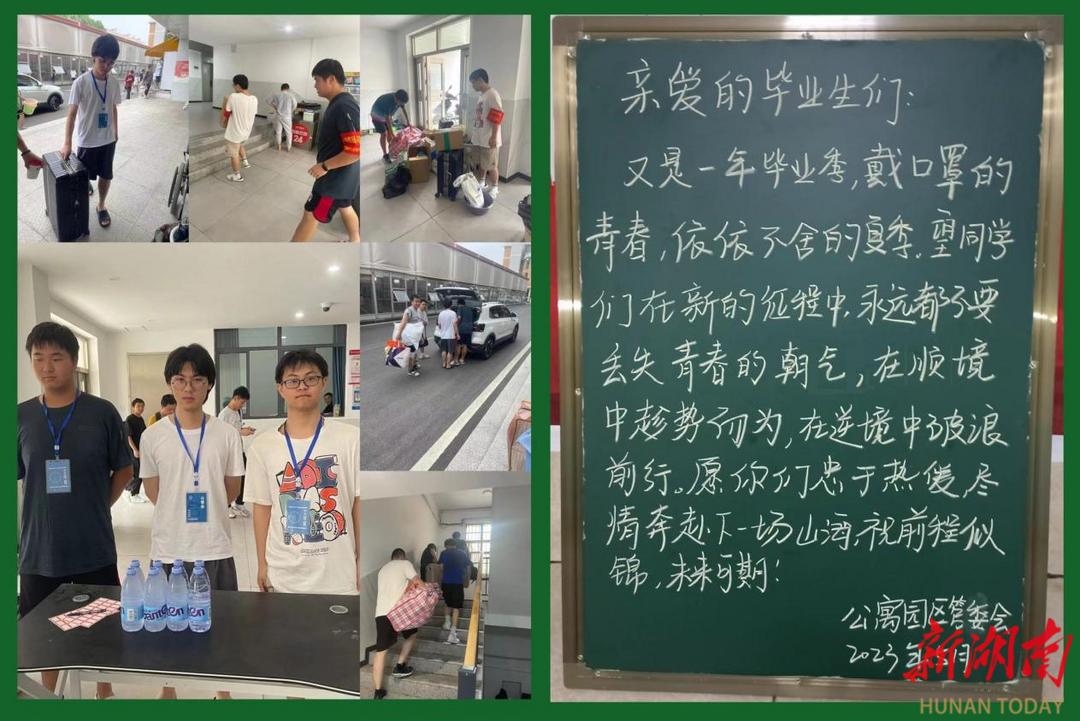 该校始终坚持“以学生为本”工作理念,各部门加强协调联动,简化流程、快速办理,让学生感受到浓浓的母校关怀。该校各学院、楼栋党支部充分履职尽责,扎实推进“我为学生办实事”实践活动,热情指导他们及时办妥各项离校手续,加班加点为毕业生办理退宿手续。同时,充分发挥学生党员和公管会学生干部的积极模范带头作用,组成志愿者帮助毕业生搬运行李等等,给予毕业生热情帮助。各楼栋还通过小黑板等书写了毕业季寄语等,营造温馨的毕业生离校氛围。