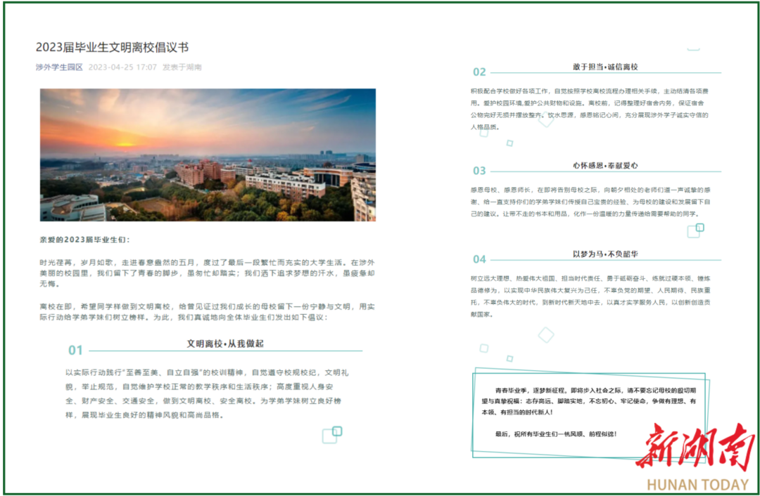同时,该校为加强毕业生文明离校教育,坚定学生理想信念,培养学生热爱母校、感恩母校之情。学生工作处组织学院开展了“留一间洁净寝室”等文明离寝活动,学生公寓园区制定发布《2023届毕业生文明离校倡议书》,号召毕业生们积极响应,为学弟学妹树立先进榜样。让毕业生从文明离寝做起,展现我校毕业生有担当、有品质、有修养的精神风貌和“涉外人”的良好形象。