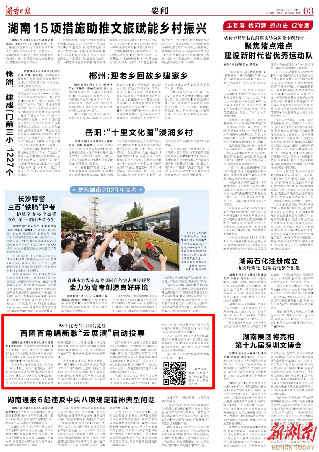 湖南日报6月6日讯(全媒体记者 龙文泱)湖湘百花竞绽放,颂歌唱响新时代。今晚8时,“贯彻二十大·百团百角唱新歌”全省文艺院团竞演活动“云展演平台”上线并启动投票。58个优秀节目同台竞技,展现新时代文艺湘军风采。