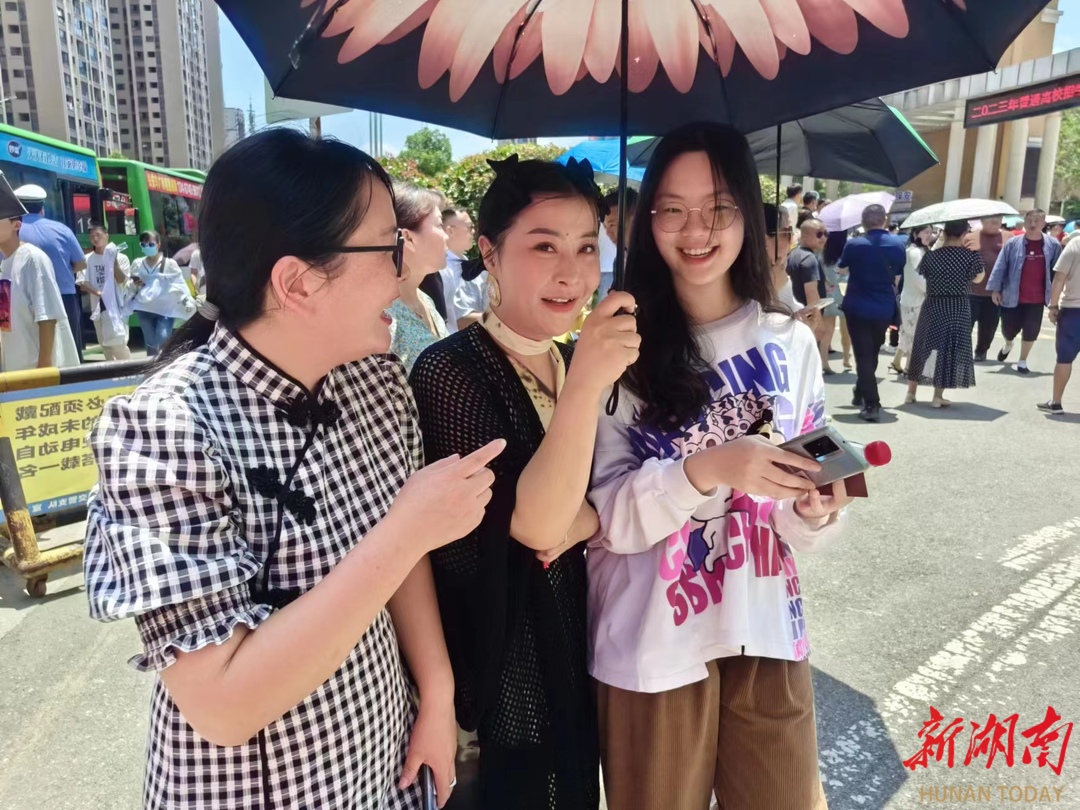 在湖天中学考点,郡永实验学校印校长(右一)和禹老师(右二)给考生鼓劲加油。(周玉意 摄)