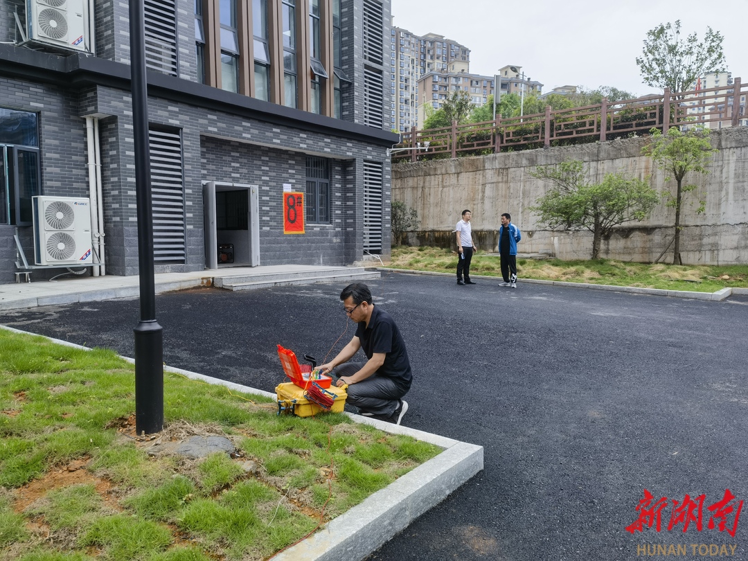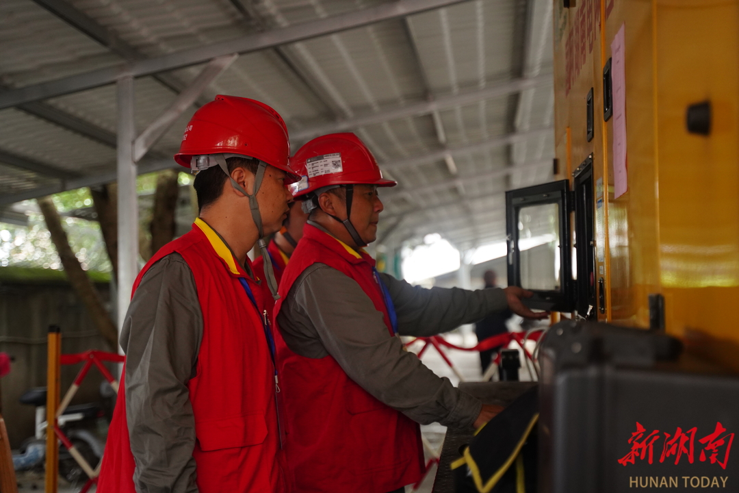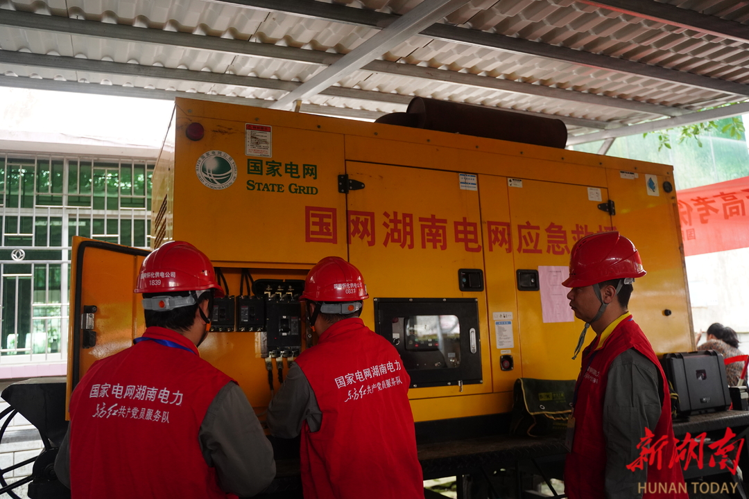 6月7日,通道一中考点,国网通道县供电公司工作人员对考点的电力设施进行专项检查,保证考试期间考点的电力设备正常运行。(赵伦 吴芝萱 摄)