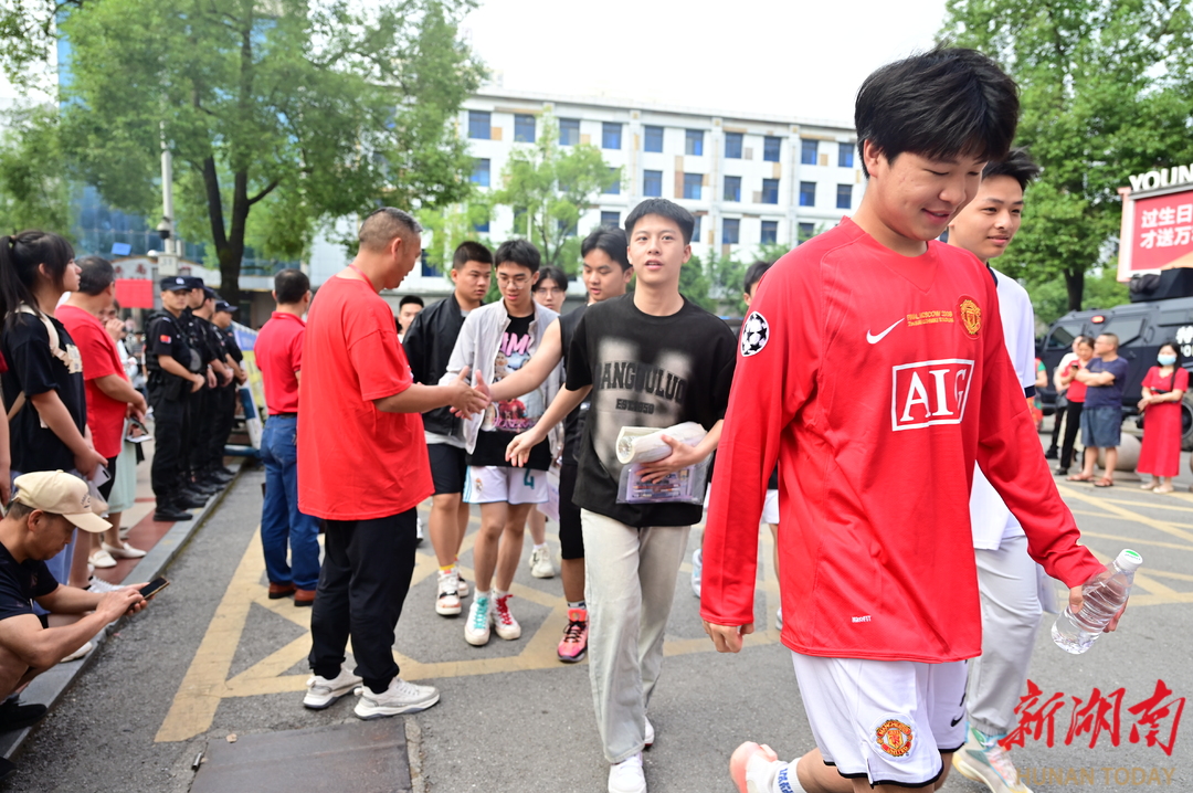6月7日8时10分,怀化三中考点,老师与考生一一击掌,对他们喊“加油”鼓励。(雷鸿涛 摄)