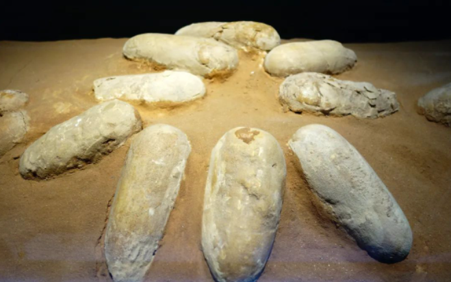 △巴彦淖尔乌拉特后旗巴彦满达呼出土的晚白垩世长形恐龙蛋化石。