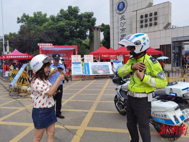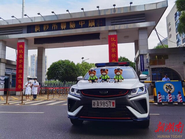 长沙市实验中学考点前,一辆车牌照内含数字985的芙蓉交警执勤车,