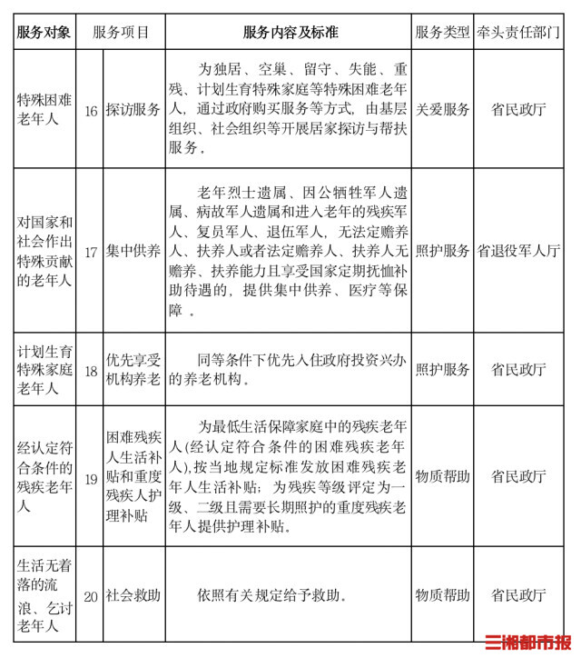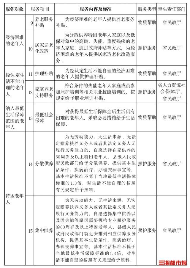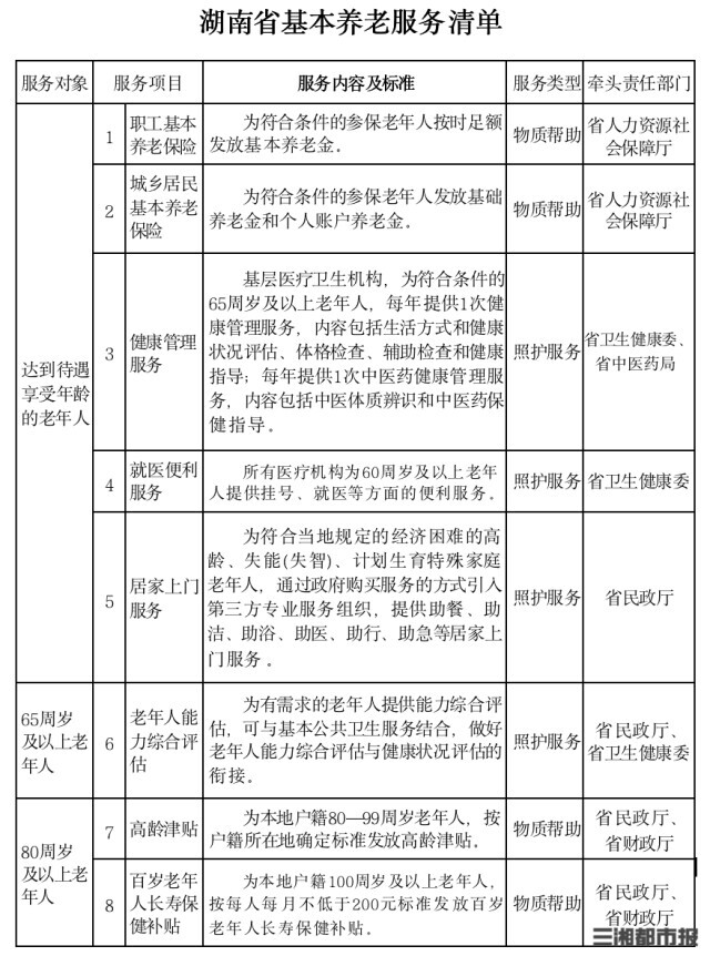 三湘都市报·新湖南客户端6月7日讯(文/视频 全媒体记者 杨昱) 对居家上门服务、老年人能力综合评估、高龄津贴、最低社会保障等服务项目进行明确规定,省政府办公厅日前印发《湖南省推进基本养老服务体系建设实施方案(2022—2025年)》,首次公布了我省20项基本养老服务清单及责任部门。