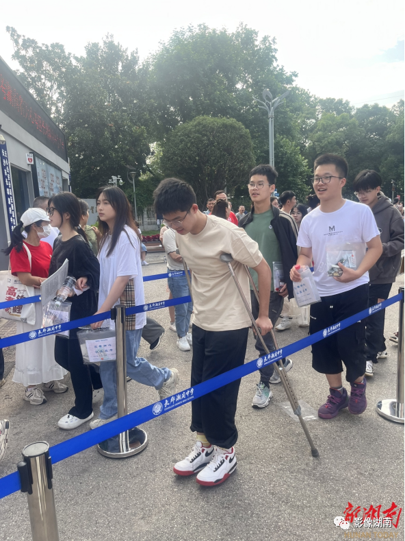 长郡湘府中学考点一考生拄着拐杖进入考场,该同学因意外受伤。“我帮你拿着考试专用包,我们一起加油。”后面的同学主动帮他。未来可期,少年加油。湖南日报全媒体记者 刘芬 摄