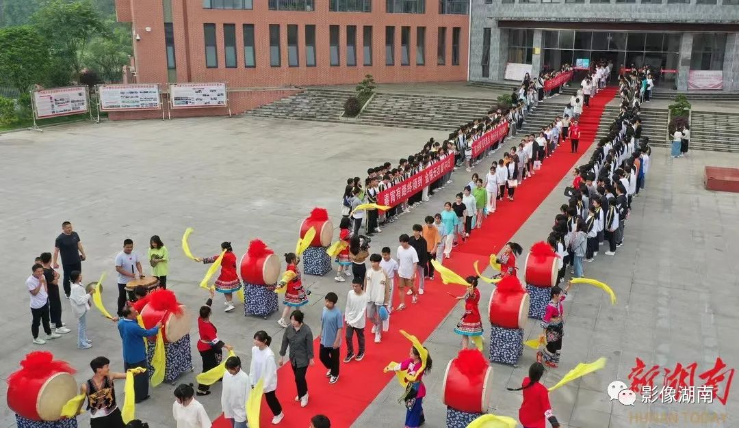 花垣县职业高级中学打苗鼓、舞龙狮欢送参加高考的职高生。龙恩泽 摄