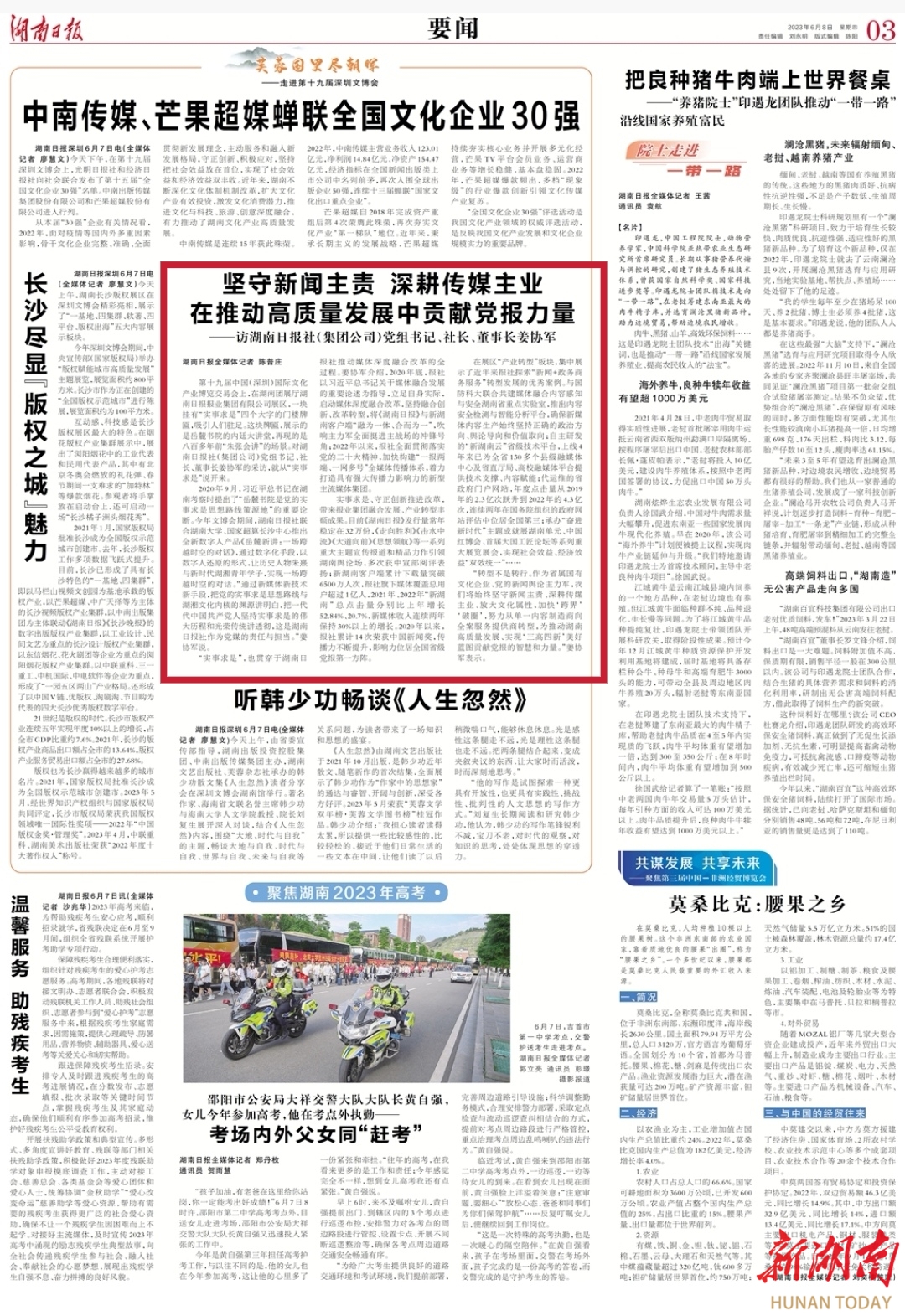 “转型不是转行。作为省属国有文化企业、党的新闻舆论主力军,我们将始终坚守新闻主责、深耕传媒主业、放大文化属性,加快‘跨界’‘破圈’,努力从单一内容制造商向全案服务提供商转型,为推动湖南高质量发展、实现‘三高四新’美好蓝图贡献党报的智慧和力量。”姜协军表示。