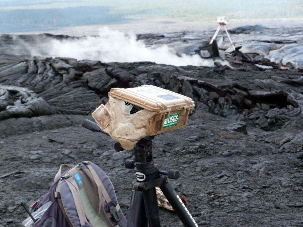 这张由美国地质勘探局提供的照片显示,2014年11月7日,在夏威夷东北部的帕霍阿镇附近,用于对熔岩进行观测的摄像机外壳被高温溶化。夏威夷基拉韦火山是世界最活跃的活火山之一。该火山喷发出的熔岩流当年11月10日蔓延至一个近千人的城镇帕霍阿镇,并点燃了该镇的房屋。新华社/美联