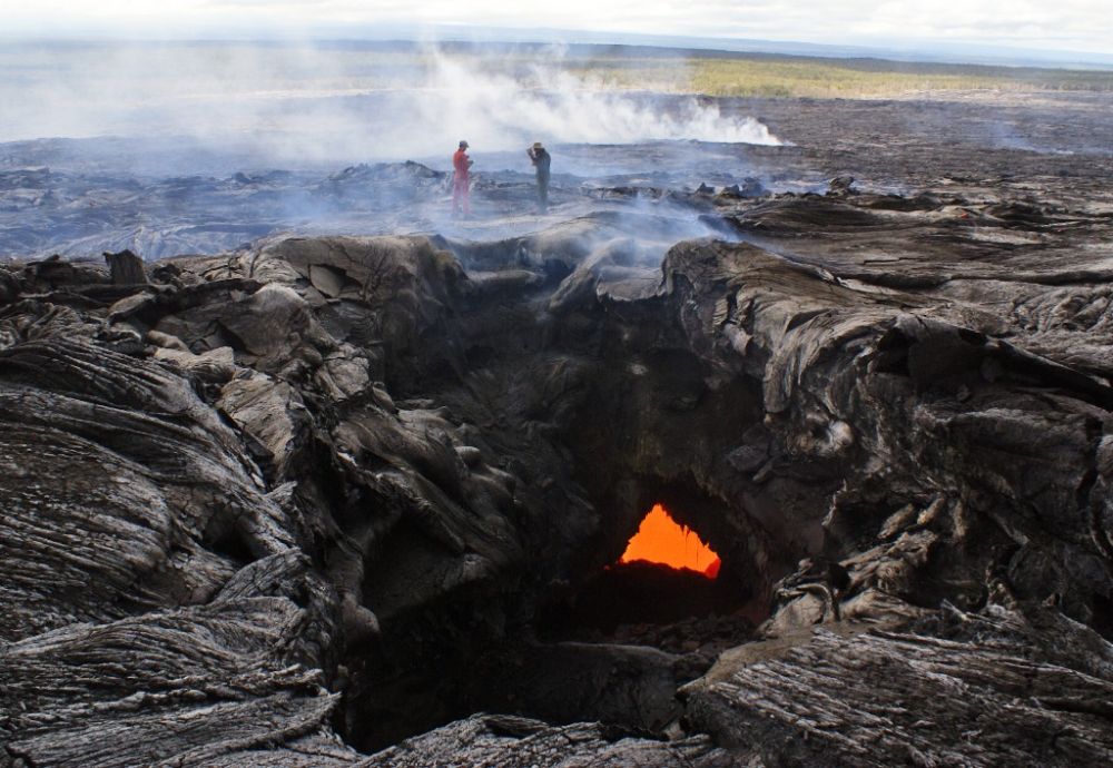 这张美国地质勘测局2014年9月15日发布的照片显示,夏威夷火山观测站的地质学家在夏威夷帕霍阿勘测基拉韦火山当年6月27日喷出的熔岩。新华社/美联