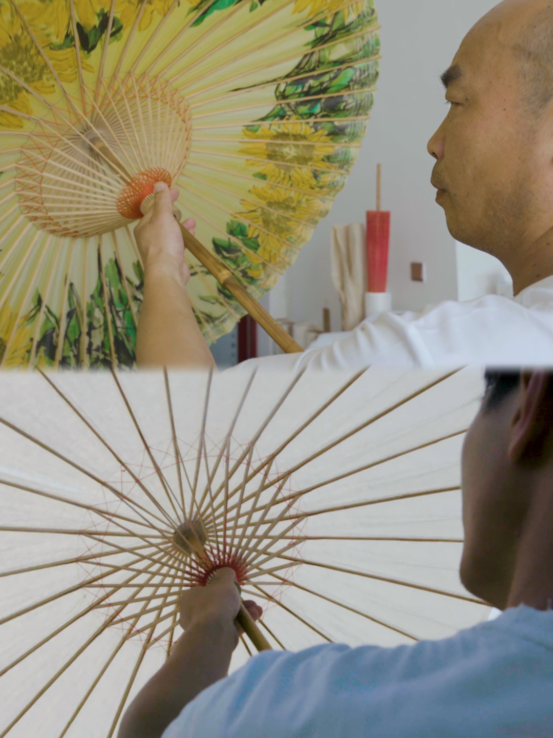 打记事起,父母一起做油纸伞的画面,便烙在了周汉宇的记忆里。周汉宇说,家里的兄弟姊妹,只有自己选择了继承父亲的这门手艺,或许是自己的性格与父亲相似,“说话不是强项,更喜欢钻研手上功夫”。如果做的油纸伞质量不过关,父亲会罚他反复练习甚至通宵,一个步骤重复做到天亮,这是常有的事。