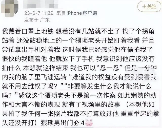 6月7日,广东广州地铁8号线上,一女子看见一大叔蹲着玩手机,怀疑对方是偷拍自己,要求检查相册。在大叔同意让她检查相册并自证清白后,该女子仍在网络曝光大叔是猥琐男,称手法娴熟不是第一次作案,并表示既然没有偷拍,那他为什么不为自己发声。