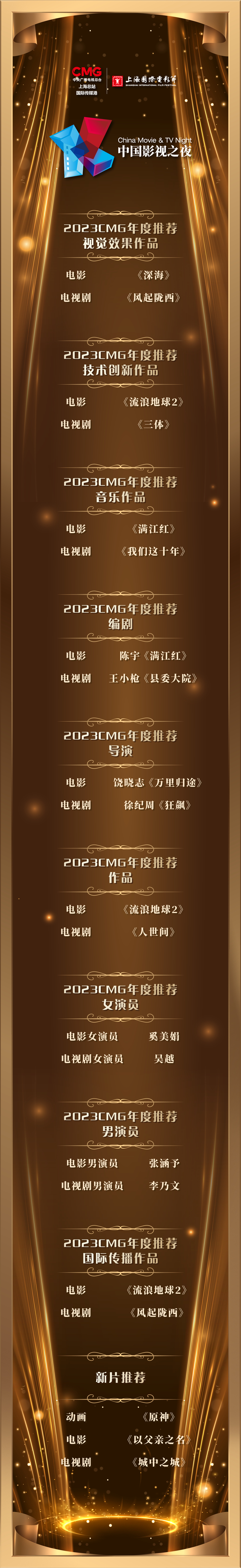 “中国影视之夜·CMG年度推荐”共进行“年度推荐作品”“年度推荐男女演员”“年度推荐导演”“年度推荐科技创新作品”等9项荣誉推荐(名单详见文末)。本届影视之夜还首次设立“年度推荐国际传播作品”,鼓励用影视作品向世界讲好中国故事,传播中华文化。电影《流浪地球2》《满江红》和电视剧《人世间》《风起陇西》《县委大院》等作品在当晚获多项荣誉推荐。