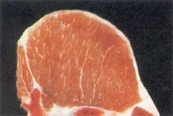 但是,如果猪在屠宰前受到了惊吓,或者由于其他因素承受了很大压力,它们就会分泌大量的肾上腺素,导致糖原快速分解。屠宰之后,乳酸便会迅速形成,而过多的乳酸会使得肉颜色泛白(Pale)、肉质极为松软(Soft)、有渗出物(Exudative)。这样的肉 24 小时后的 pH 值能降到 5.4~5.6 之间,被称为“PSE 肉”。