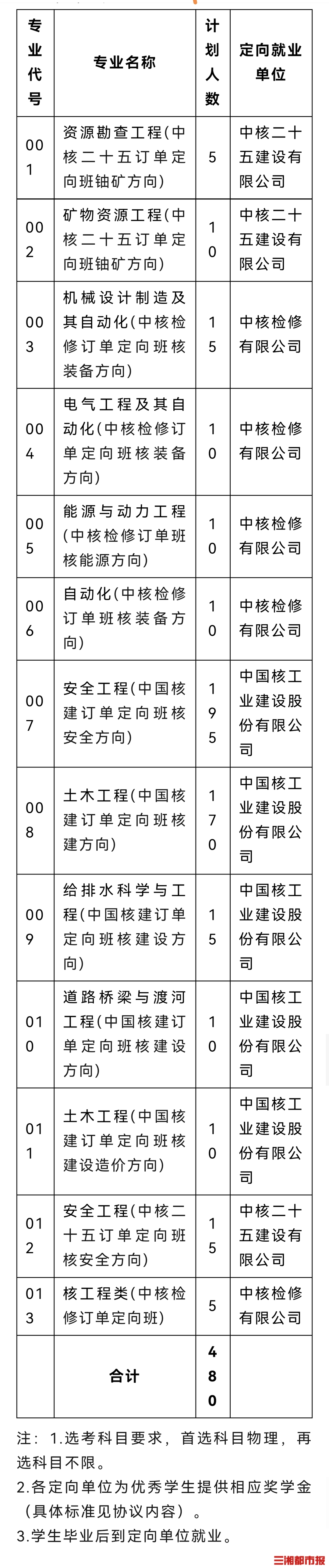 三湘都市报·新湖南客户端6月13日讯(全媒体记者 杨斯涵 黄京)全国首个核产业特岗!招480人!毕业即就业!近日,南华大学2023年核产业特岗订单定向班招生章程发布,参加2023年全国统一普通高等学校招生考试,成绩达到湖南省本科批物理科类录取控制分数线的应往届普通高中毕业生均可报名。