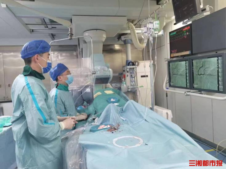 情况紧急,社区医院联系湖南省第二人民医院后,医院胸痛中心绿色通道快速反应,实行“双绕行”模式,绕过急诊、绕过CCU病房,救护车直接将病人送入导管室,手术开通梗死血管,成功为杨先生实施介入手术。