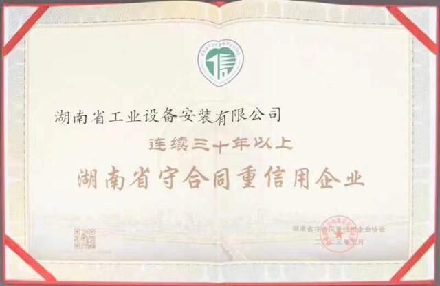 (湖南安装获得“连续三十年以上湖南省守合同重信用企业”称号。)