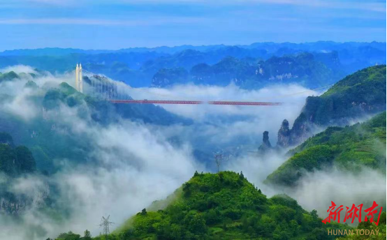 6月15日,吉首市雨雾朦胧。德夯大峡谷上,那座世界罕见的特大悬索桥在云雾中若隐若现,宛如架在云端上的彩虹,令人叹为观止。这座非同寻常的桥就是矮寨大桥,曾被美国国家广播公司NBC推荐为“十大非去不可的世界新地标”,已成为美丽湘西走向世界的又一张“新名片”。来自长沙市的王先生仔细凝视着黄老亲笔题写的“矮寨大桥”四个字后表示:“那个‘桥’字有讲究,左边的‘木’字像一竖串着‘S’型,就像大桥立于矮寨坡弯曲的公路之上一样。”黄老所书的“矮寨大桥”四个字,正不断加持着吉首文旅融合发展,每天均能吸引成百上千名游客来此打卡游玩。