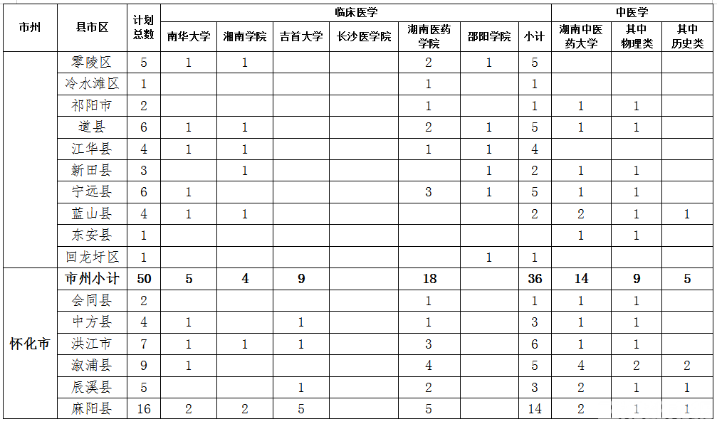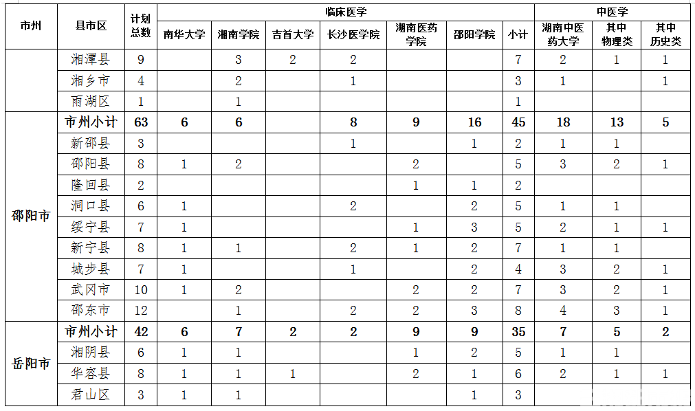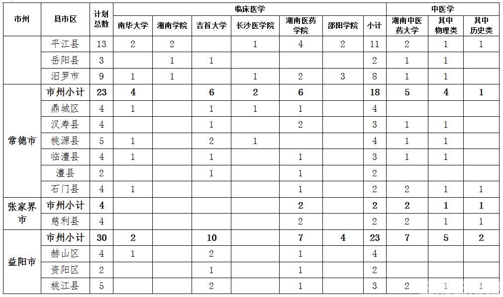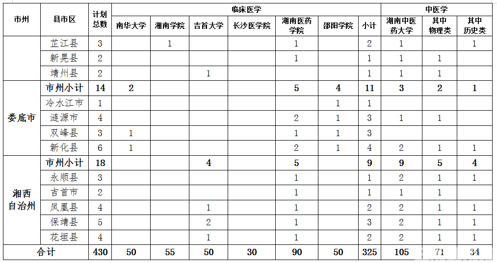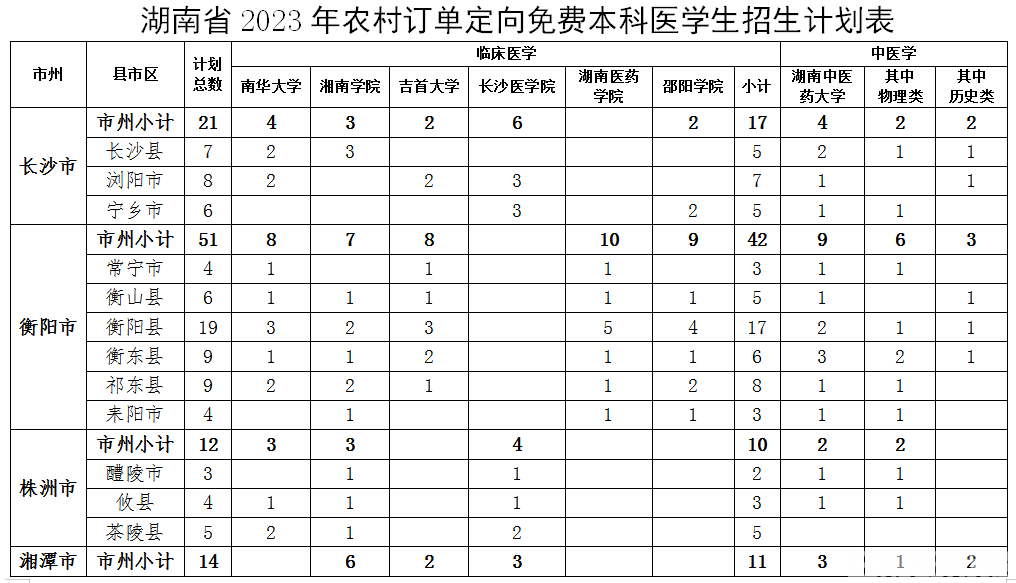 据悉,2023年我省定向医学生招生计划为430人,其中,临床医学专业招生325人、中医学专业招生105人。临床医学专业培养高校及招生计划为南华大学50人、吉首大学50人、湘南学院55人、长沙医学院30人、湖南医药学院90人、邵阳学院50人;中医学专业培养高校及招生计划为湖南中医药大学105人。上述招生计划均纳入各培养高校年度招生总计划。