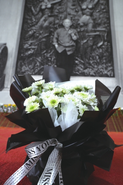 6月15日,吉首大学,黄永玉艺术博物馆里,黄永玉先生的大幅照片下摆放着鲜花。组图/记者吴琳红