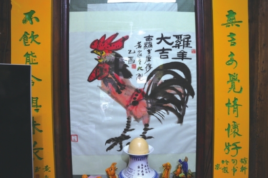 黄永前家的客厅里挂着黄永玉画的雄鸡,这是黄永玉送给属鸡的弟弟的礼物。