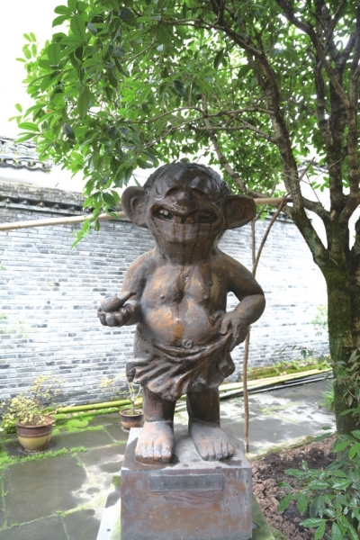 凤凰县,黄永前家的院子里摆放着黄永玉的塑像。