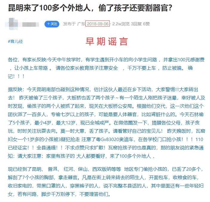 经昆明网警多方核查,当地并无类似案件与警情发生。搜索中网警发现,该谣言信息最早出现于2015年,在全国各地都出现了多个版本,各地网警部门也曾多次发布辟谣文章。