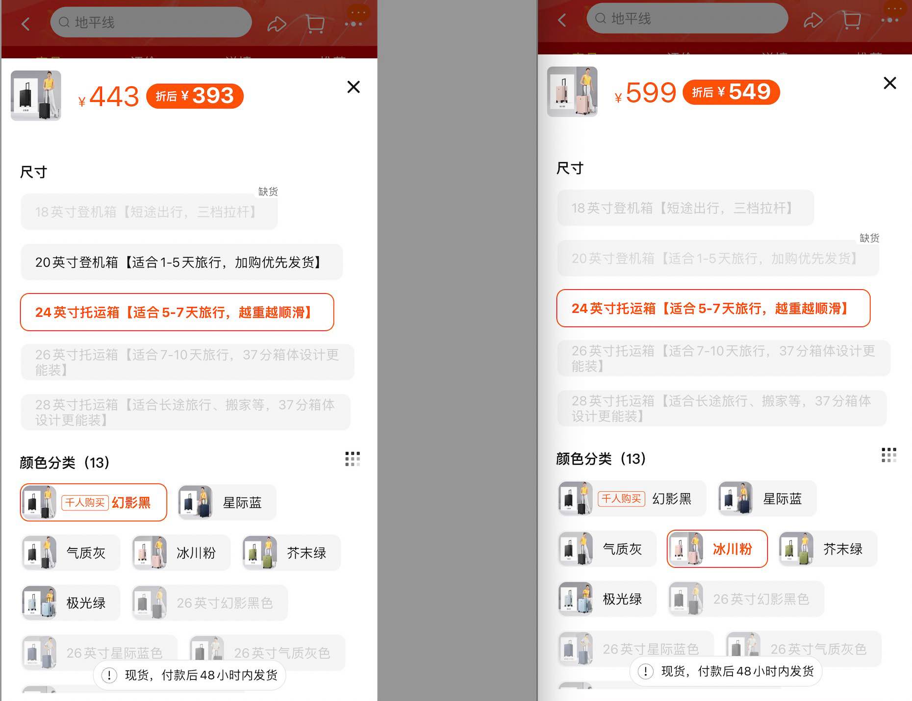 她向澎湃新闻介绍称,自己准备在“618”期间购买一款行李箱,看中了“地平线8号”品牌的一款24寸托运箱,却意外发现同一型号、大小的行李箱,粉红色价格为549元,黑色却仅需393元。