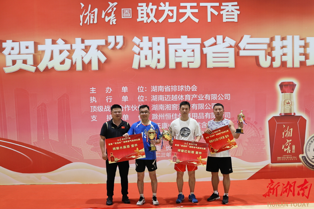 湖南日报·新湖南客户端6月19日讯(记者 蔡矜宜)6月16日至18日,首届“贺龙杯”湖南省气排球比赛在迈越体育运动中心举行,来自全省各市州的40支队伍、近千名选手经过近百场角逐,最终0730俱乐部队、黑鲨俱乐部队、湖南日报社队、新化排协女中队分别获得青年男子、女子组,中年男子、女子组冠军。