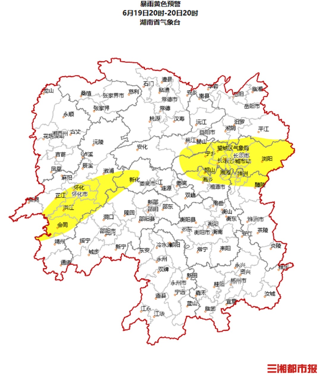 三湘都市报·新湖南客户端6月19日讯(全媒体记者 李致远 实习生 曾澜 通讯员 林城)湖南省气象台6月19日16时发布暴雨黄色预警:预计19日20时至20日20时,长沙、湘潭北部、怀化南部、娄底西北部部分地区将出现暴雨,局地大暴雨,并伴有短时强降水、雷雨大风等强对流天气,请加强防范。