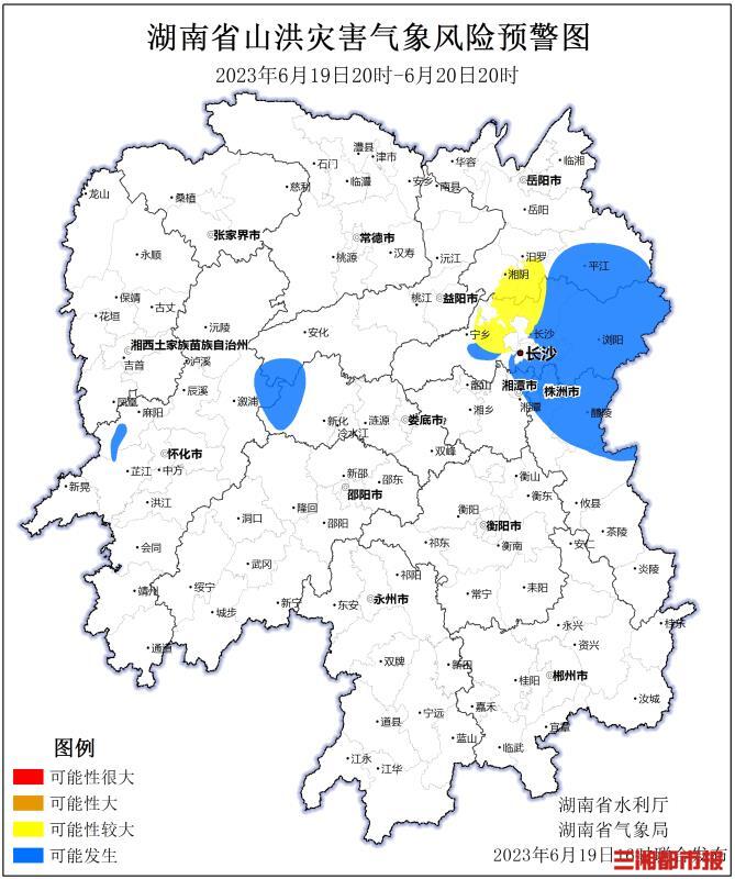 同日,根据湖南省气象台2023年6月19日短期气象预报情况,湖南省水利厅与湖南省气象局联合会商得出如下结论:自6月19日 20:00至20日20:00,受降雨影响,怀化市、益阳市、娄底市、长沙市、株洲市、岳阳市、湘潭市等局地可能发生山洪灾害(蓝色预警),岳阳市、长沙市等局地发生山洪灾害的可能性较大(黄色预警)。