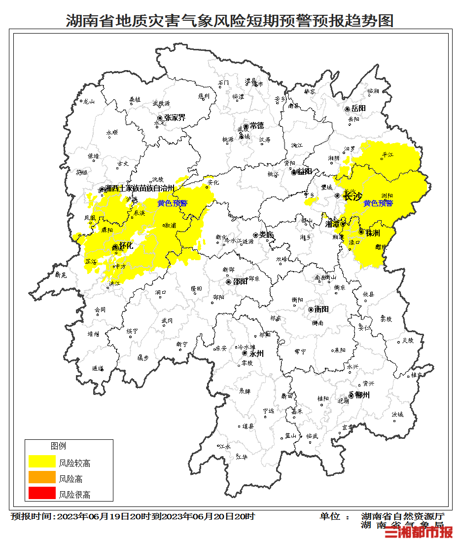 此外,根据地质灾害成灾规律和孕灾条件,结合2023年6月19日短期气象预报情况,省自然资源厅与省气象局联合会商得出如下结论:自6月19日20:00至20日20:00,受降雨影响,湘东北、湘中、湘西大部分区域发生突发性地质灾害风险较高(黄色预警)。