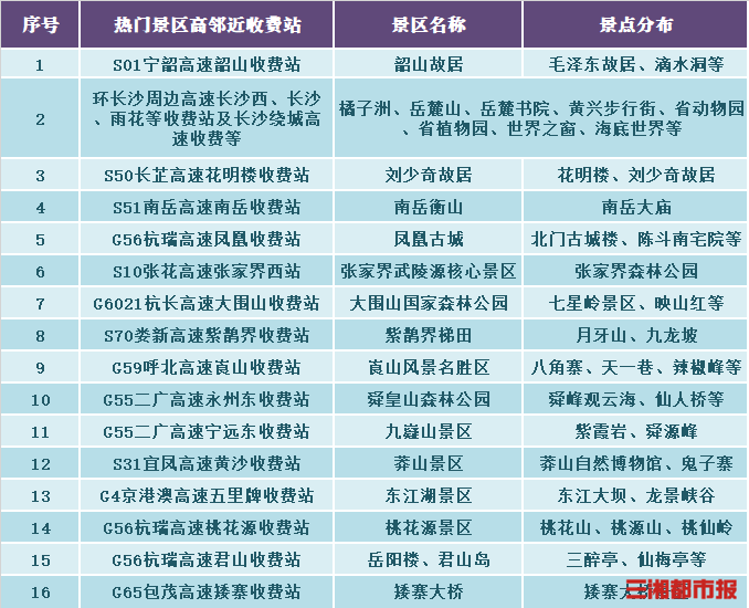 今年端午假期正好位于中考、高考结束后,预计将会迎来一波亲子游、毕业游,省内热门景区出游热度较去年有明显上升,出行方式主要是中、短途自驾出行。预计省会城市长沙市、湘潭市毛泽东故居、张家界国家森林公园、湘西州凤凰古城景区、衡阳市南岳衡山等周边高速收费站流量较大,易造成缓行。