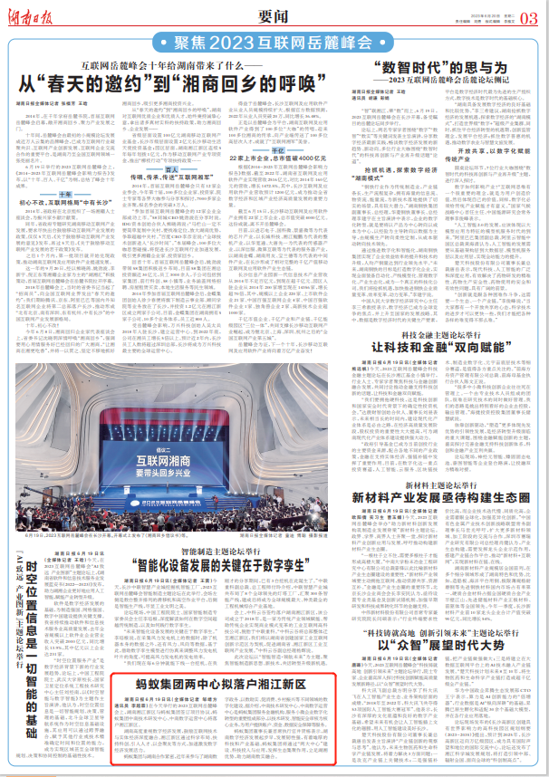 湖南日报6月19日讯(全媒体记者 邹靖方 通讯员 李超霖)在今天举行的2023互联网岳麓峰会上,湖南湘江新区与蚂蚁集团签订项目协议,蚂蚁集团中南技术研发中心、中南数字运营中心将落户湘江新区。